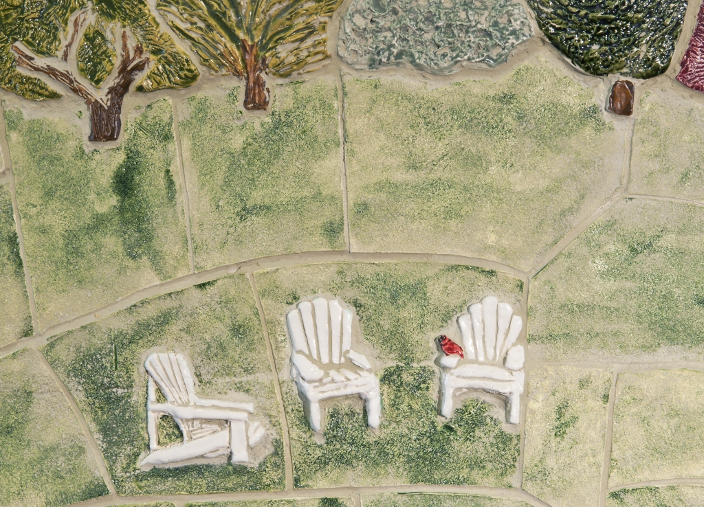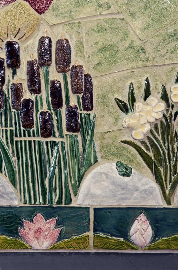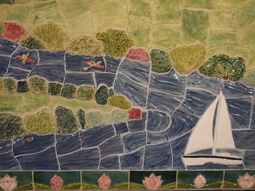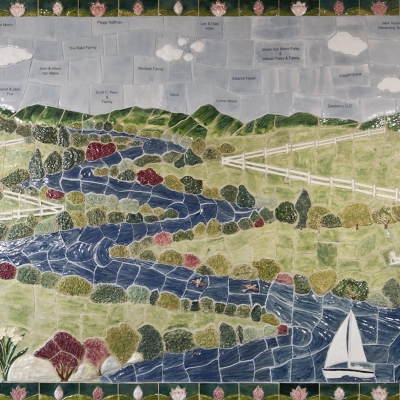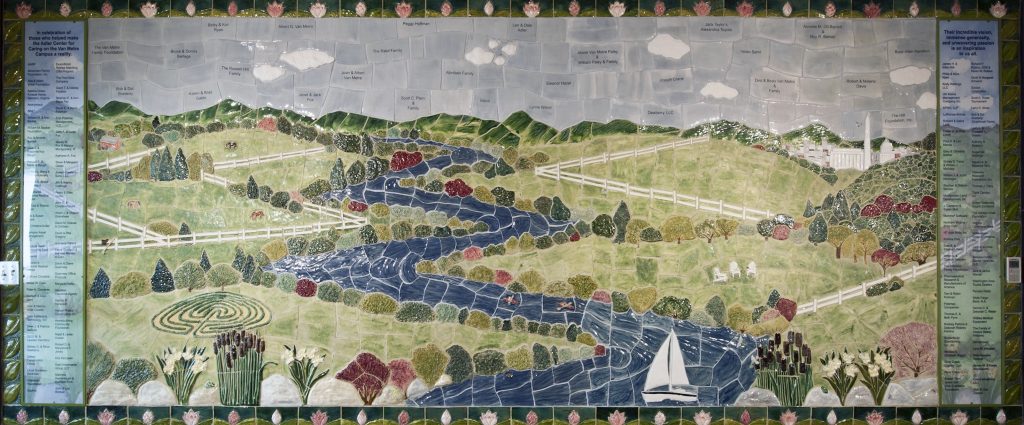 Major donors are recognized in the skyline with sandblasted tiles and additional levels are recognized in the “watercolor wall” side panels.