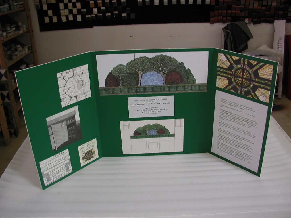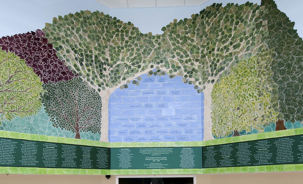 Located in the school’s main entry, our project features a 9′ high by 36′ wide ceramic tile mural of the trees on campus, with the focal point on the arch in the center. Highest giving levels were recognized in the water with sand blasted tiles.