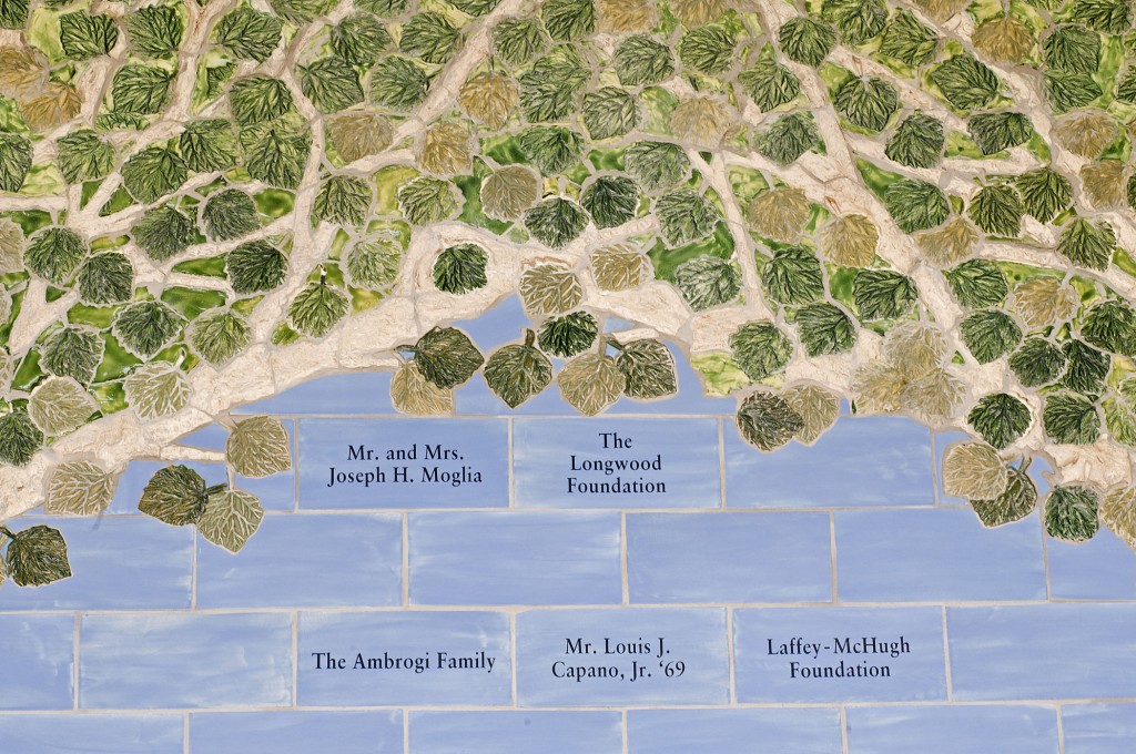 The laurel ceramic tiles frame the text panels of laminated digital print mounted to acrylic, recognizing other levels of giving.