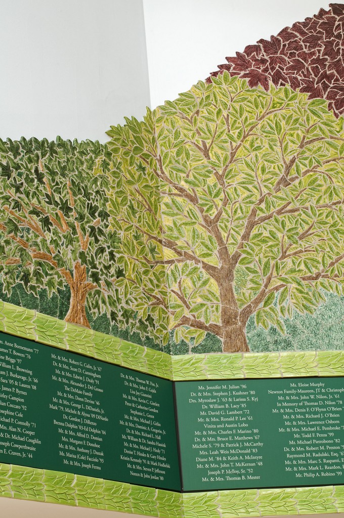 The creative donor wall was inspired by the origin of the school name: A view of the Delaware River through an arch shaped break in the trees.
