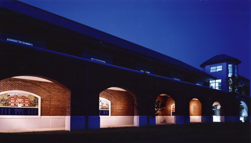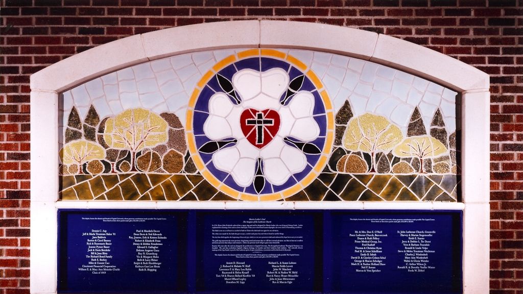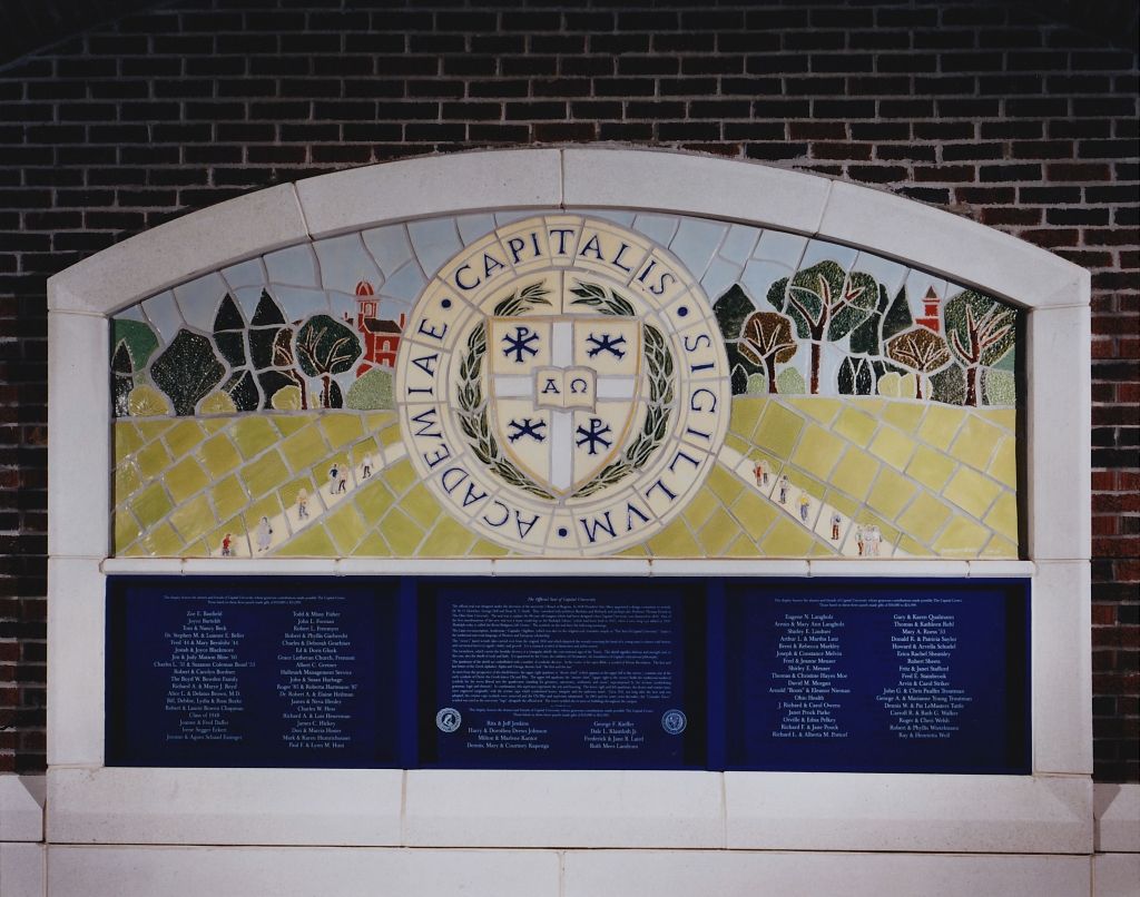 Exterior custom ceramic tile and glass donor recognition system for Capital’s new athletic facility. Imagery includes: the original Loy Gym building, the iconic front gates, and the Lutheran & Capital University Seals.