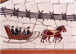 The building panel depicts the library and children dancing around the maypole on May Day, an AFS tradition.