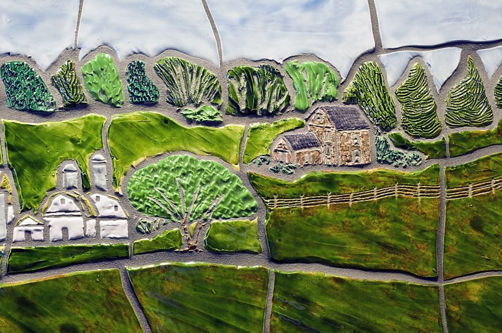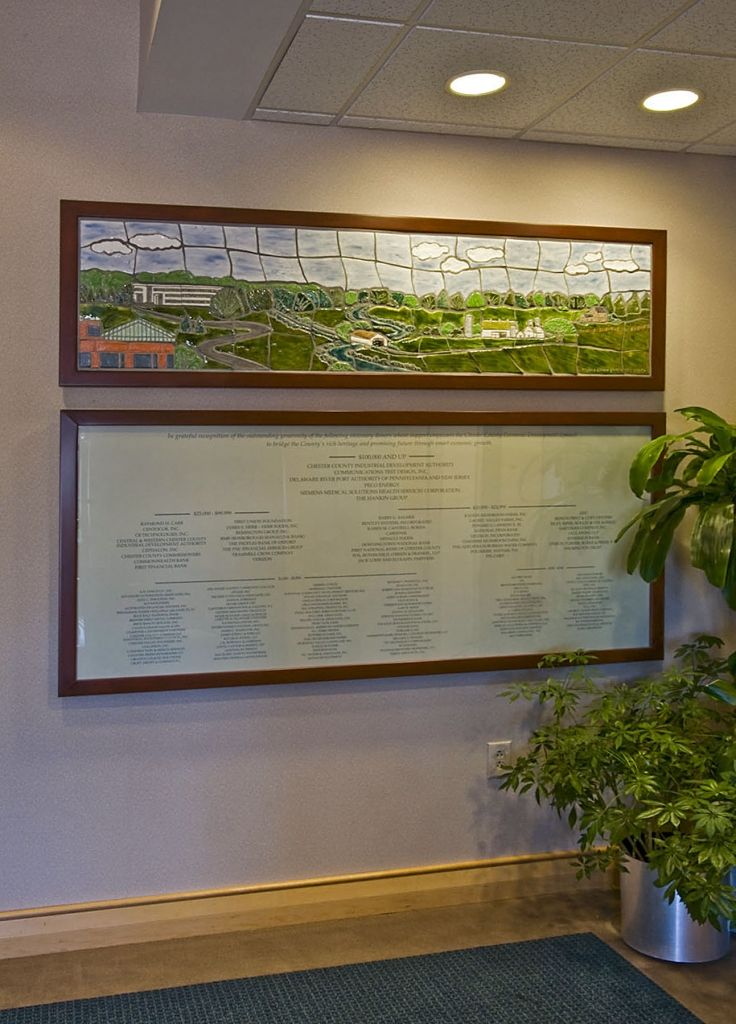 A ceramic tile mural header panel that depicts a landscape of Chester County including recognizable landmarks.