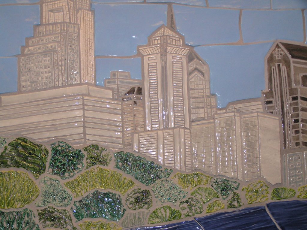 The donor recognition wall consists of a ceramic tile mural depicting the Delaware River and the Philadelphia skyline. The mural is flanked by two columns listing donor names.