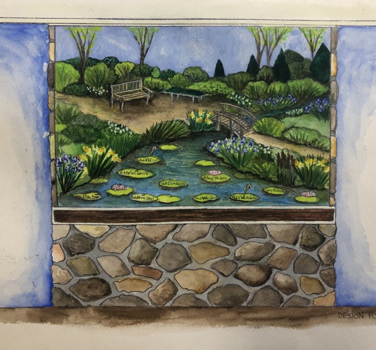 Two watercolor wall side panels were created to acknowledge the middle levels of giving and create continuity with the center mural. Installed on walls to the left & the right of the mural, they continue the mural’s pathway showing the stream, bridges, and foliage. Ceramic tile headers and footers depicting clouds at the top and rocks at the bottom complete the design.