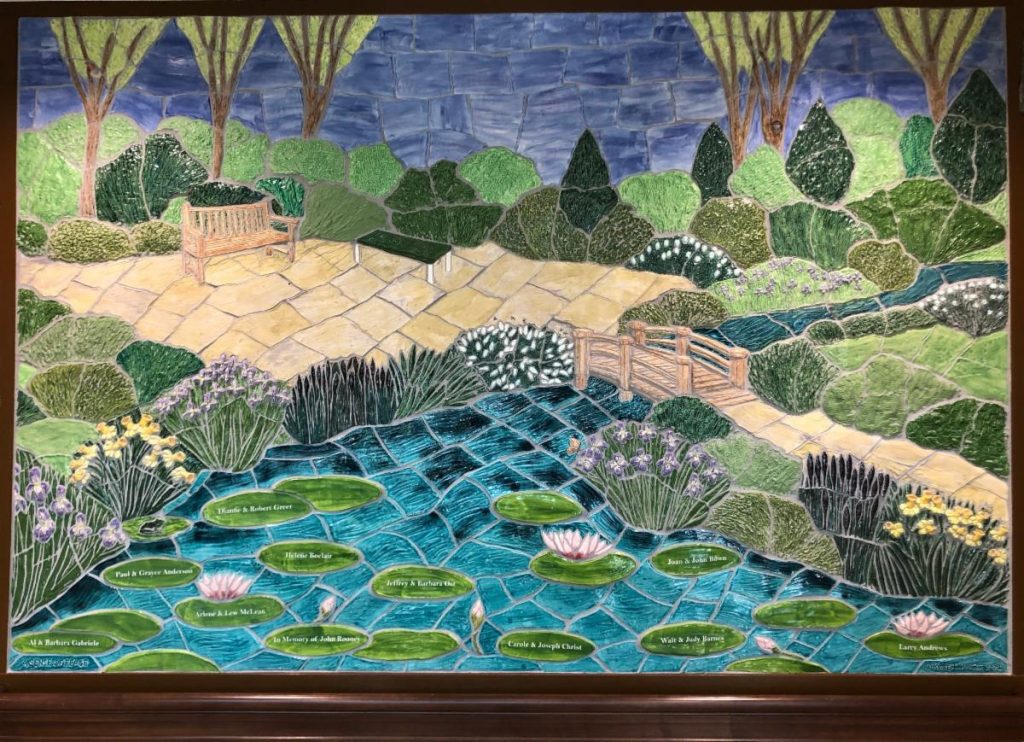 Meadowood’s first capital campaign to build a state-of-the-art memory care facility was successful! To recognize the support of the donors, Meadowood Senior Living commissioned us to create a donor wall that captures the essence of the community, which definitely included the grounds of their campus in a ceramic tile mural.
