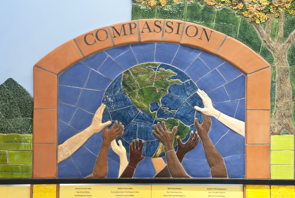 Compassion is shown by student hands reaching out to engage with the world in service to others.