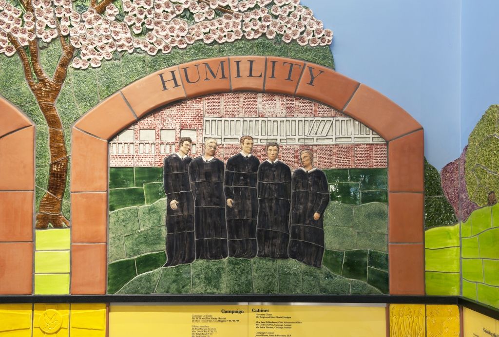 Humility is depicted by a group of Xaverian Brothers wearing the traditional habit. The Brothers opened the school in 1958.