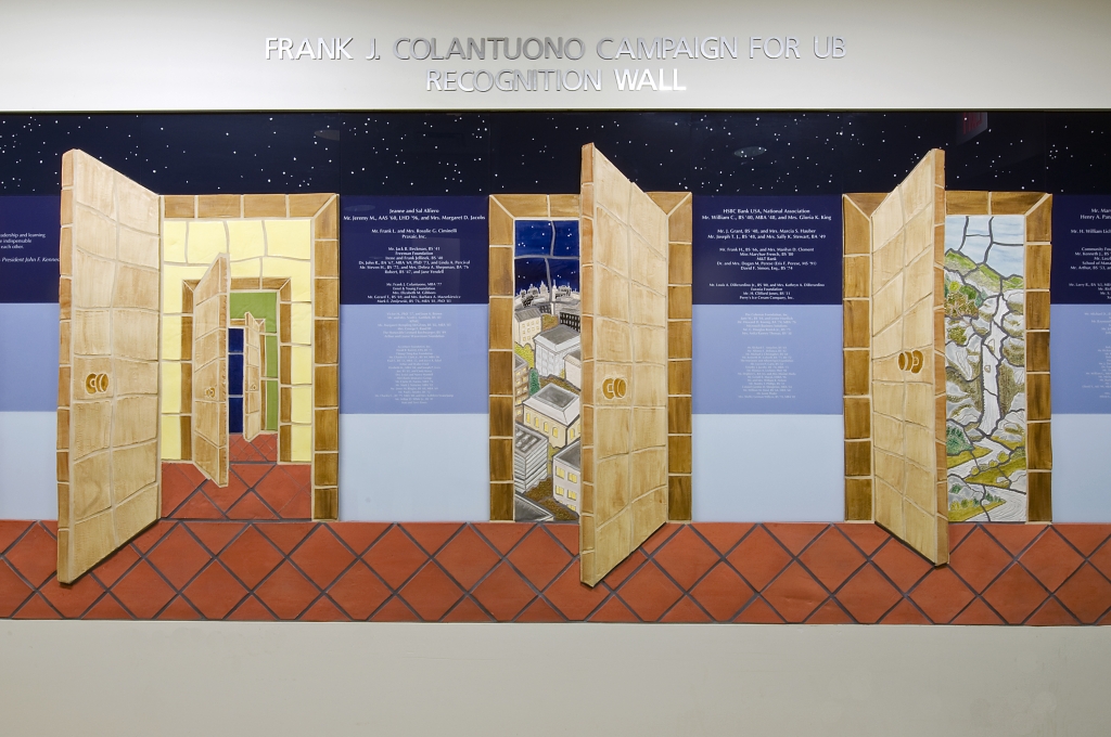 A twenty-eight foot long ceramic tile and glass mural with the theme of “opening doors” to commemorate the donors to the Campaign for UB.