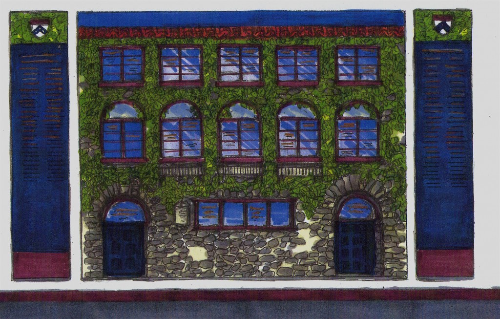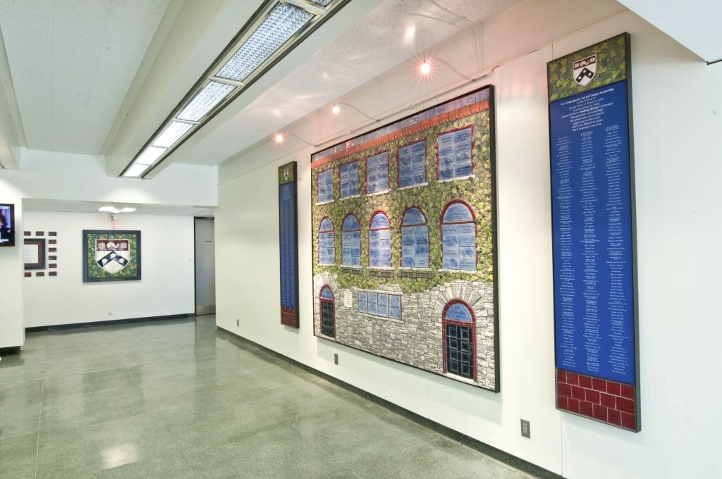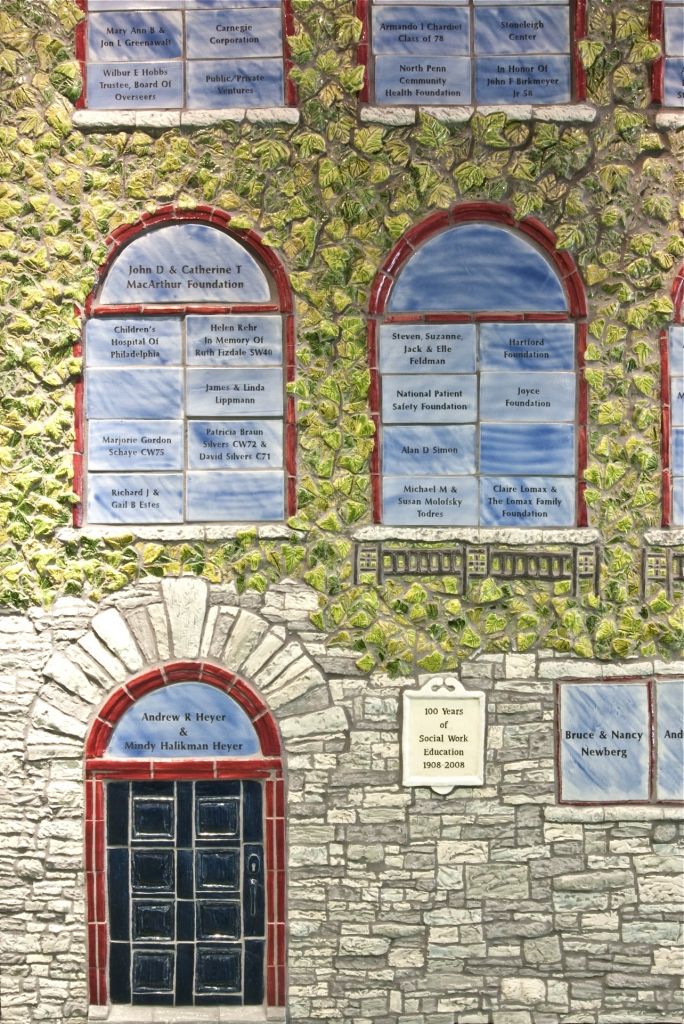 The Centennial Wall was commissioned as a recognition incentive for alumni and donors. The ceramic tile fine art donor wall depicts the original School of Social Work on Pine Street. At the School of Social Policy & Practice, the wall is a historical memento to commemorate 100 years at Penn.