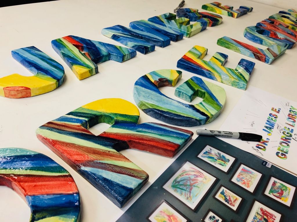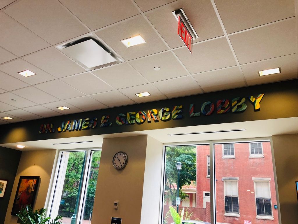 We were commissioned to create the signage to name the lobby. The 8″ high by 3/4″ deep ceramic tile letters are glazed to mimic the strong gesture and bright color of Dr. George’s painting style.